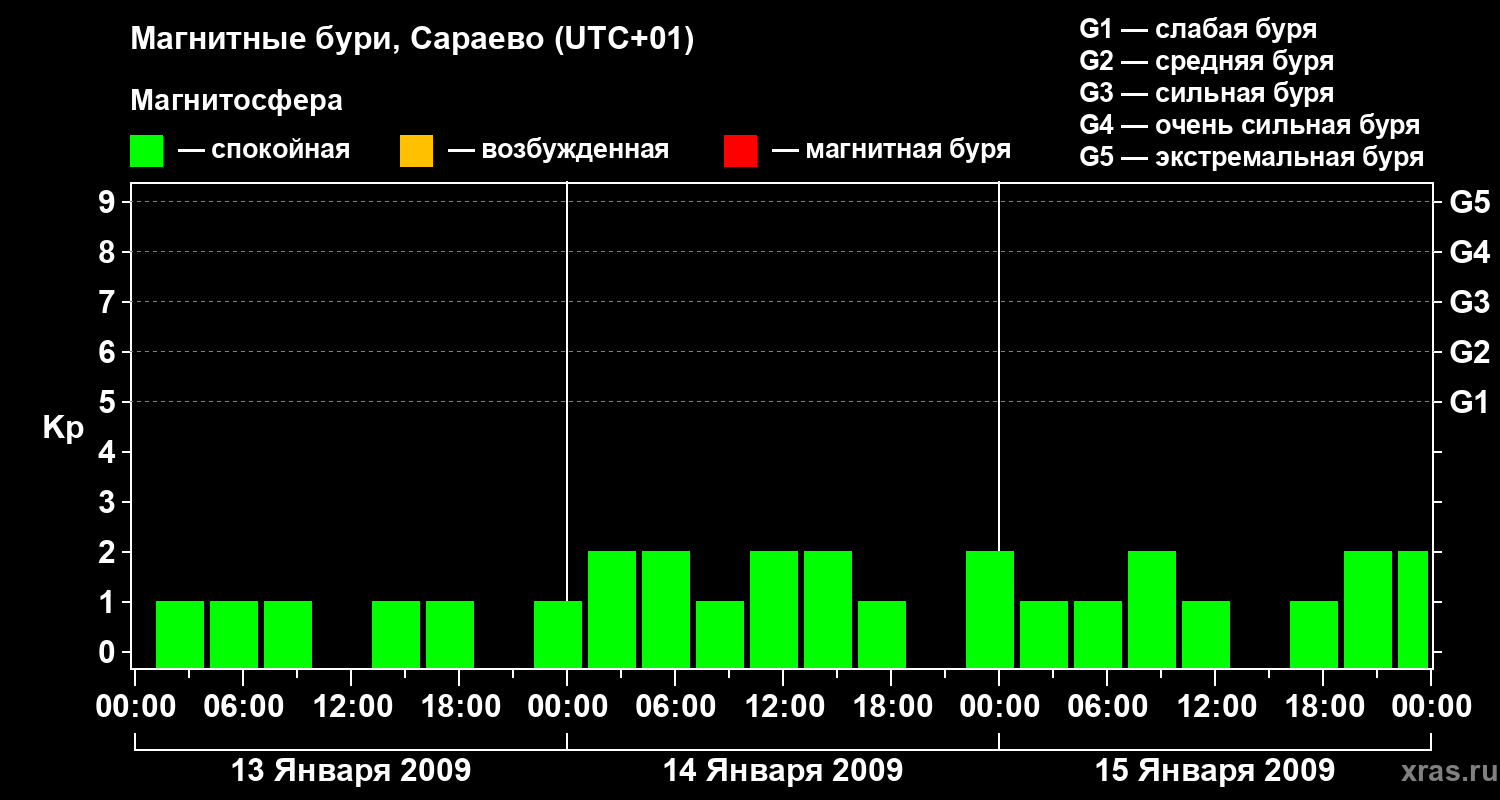 Изменения геомагнитного индекса Kp с 13 по 15 января 2009 года для средних широт