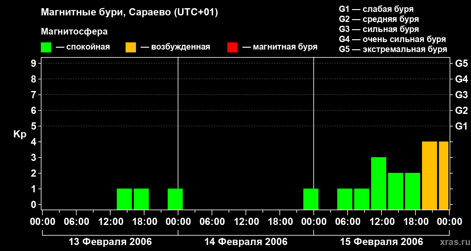 Изменения геомагнитного индекса Kp с 13 по 15 февраля 2006 года для средних широт