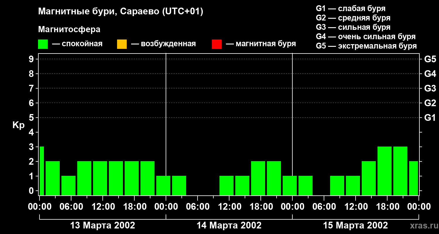 Изменения геомагнитного индекса Kp с 13 по 15 марта 2002 года для средних широт