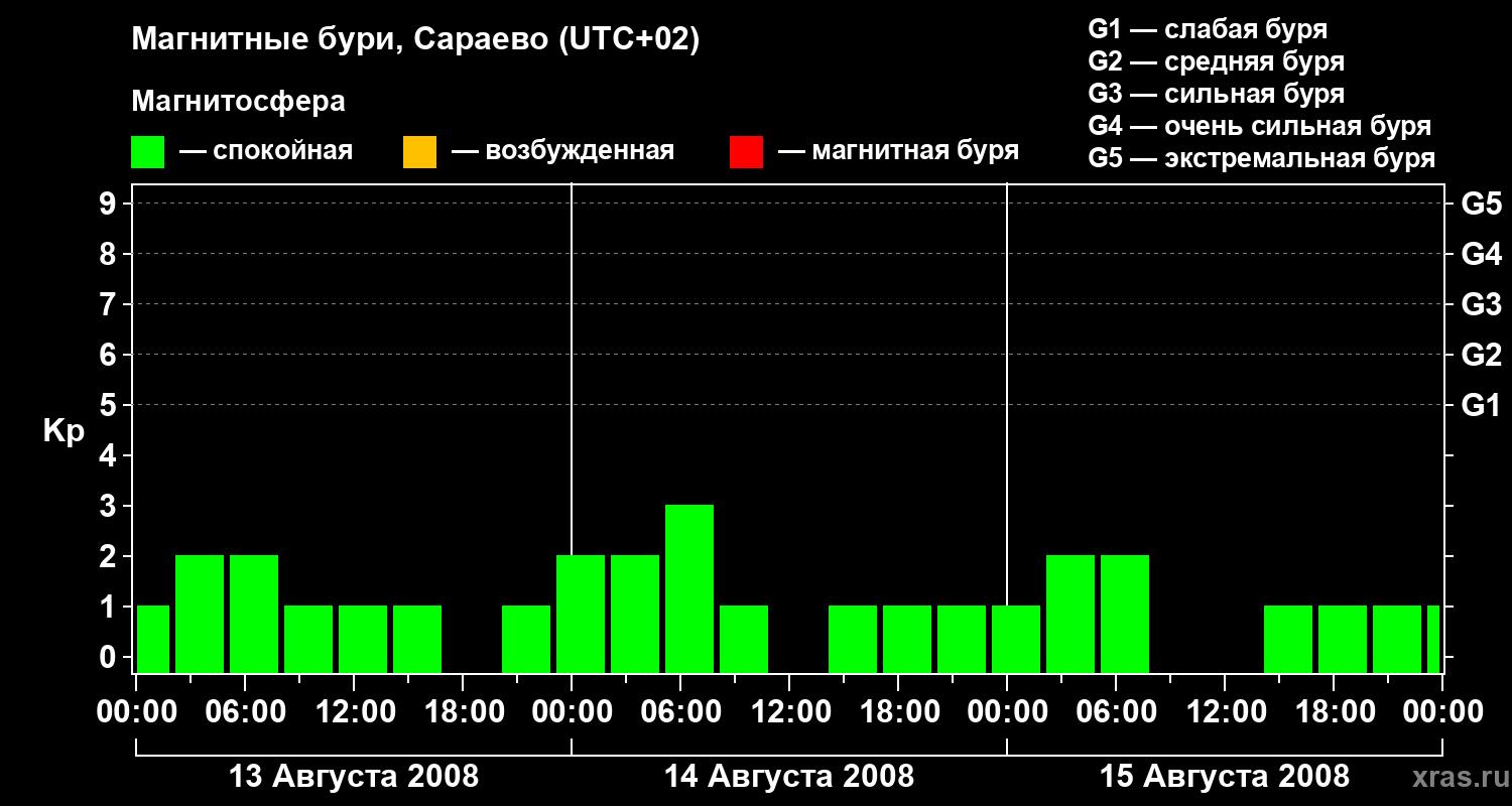 Изменения геомагнитного индекса Kp с 13 по 15 августа 2008 года для средних широт