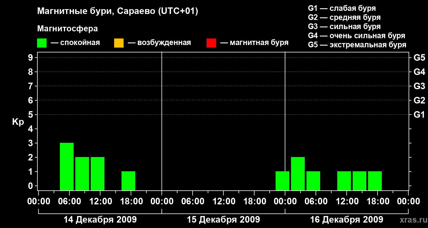 Изменения геомагнитного индекса Kp с 14 по 16 декабря 2009 года для средних широт