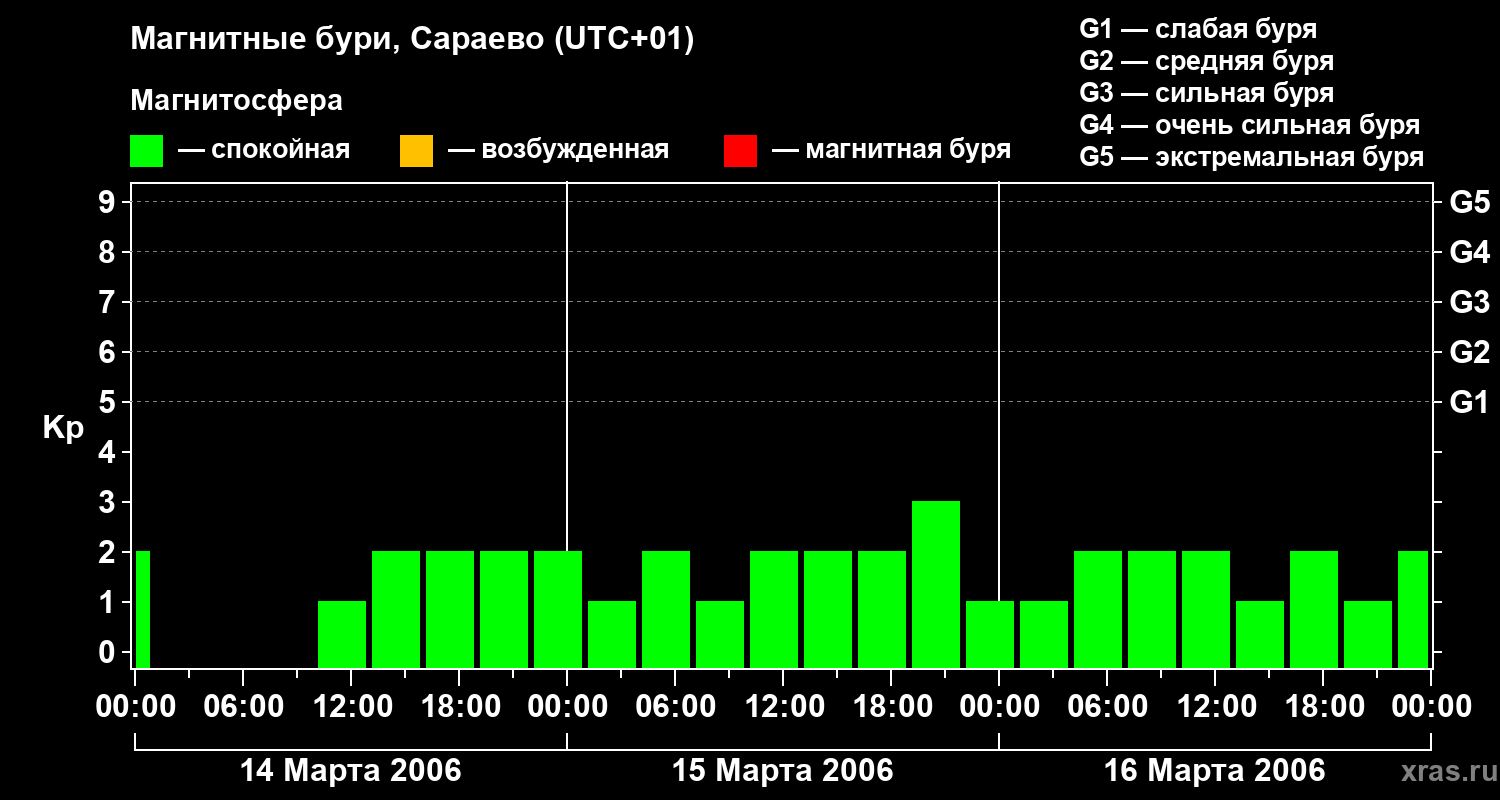 Изменения геомагнитного индекса Kp с 14 по 16 марта 2006 года для средних широт