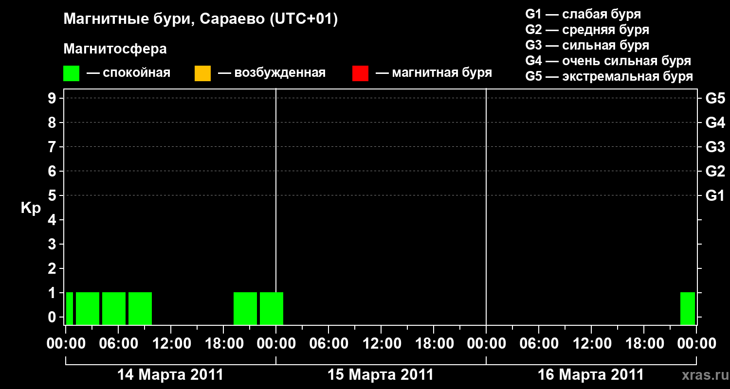 Изменения геомагнитного индекса Kp с 14 по 16 марта 2011 года для средних широт