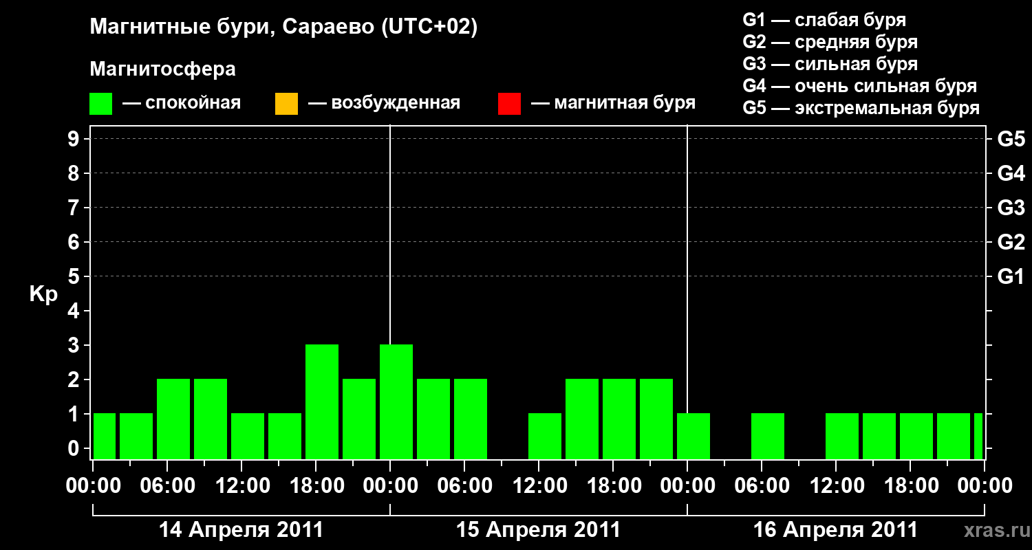 Изменения геомагнитного индекса Kp с 14 по 16 апреля 2011 года для средних широт