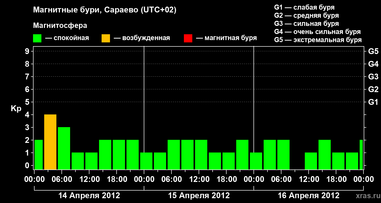 Изменения геомагнитного индекса Kp с 14 по 16 апреля 2012 года для средних широт