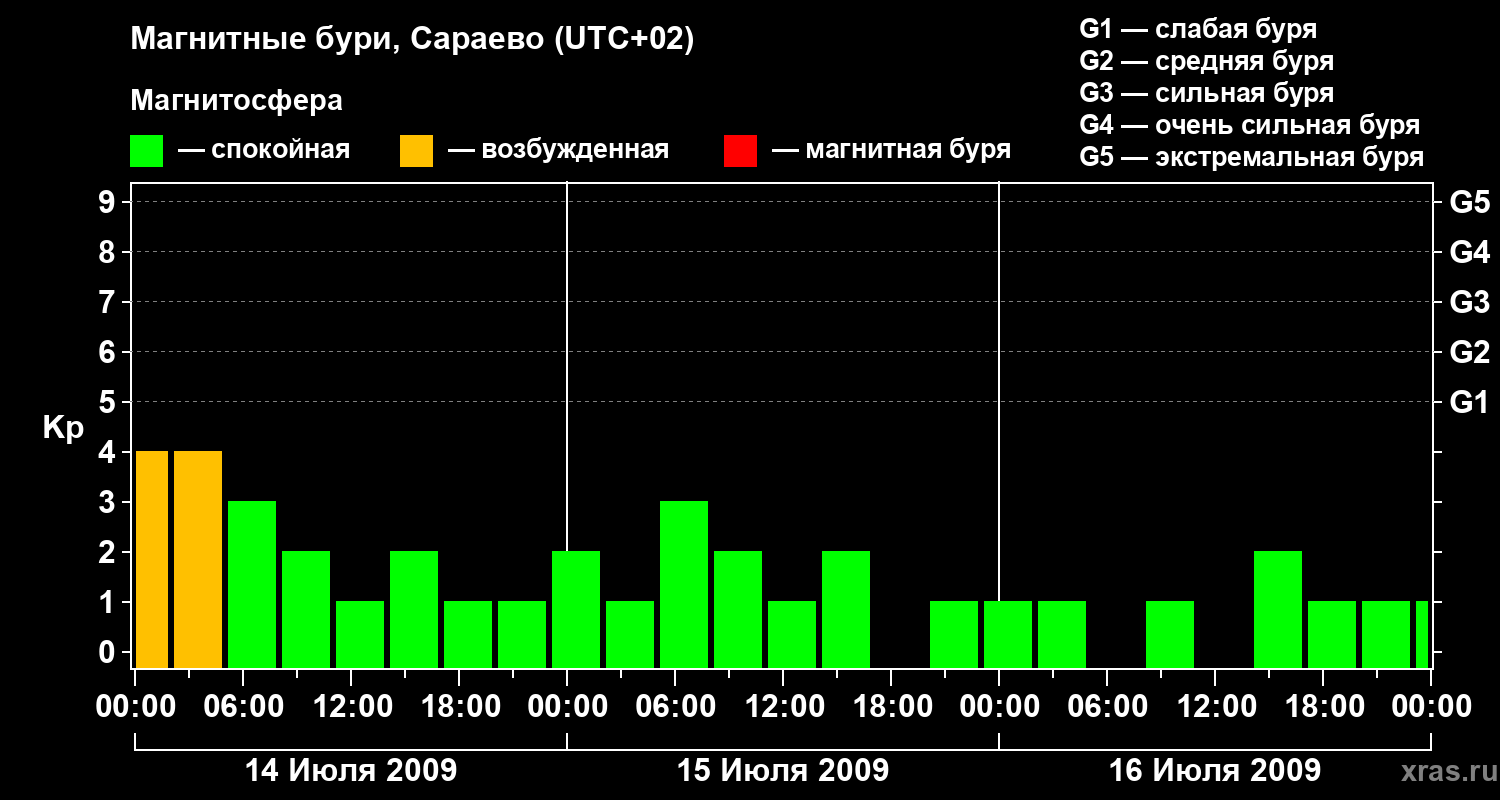 Изменения геомагнитного индекса Kp с 14 по 16 июля 2009 года для средних широт