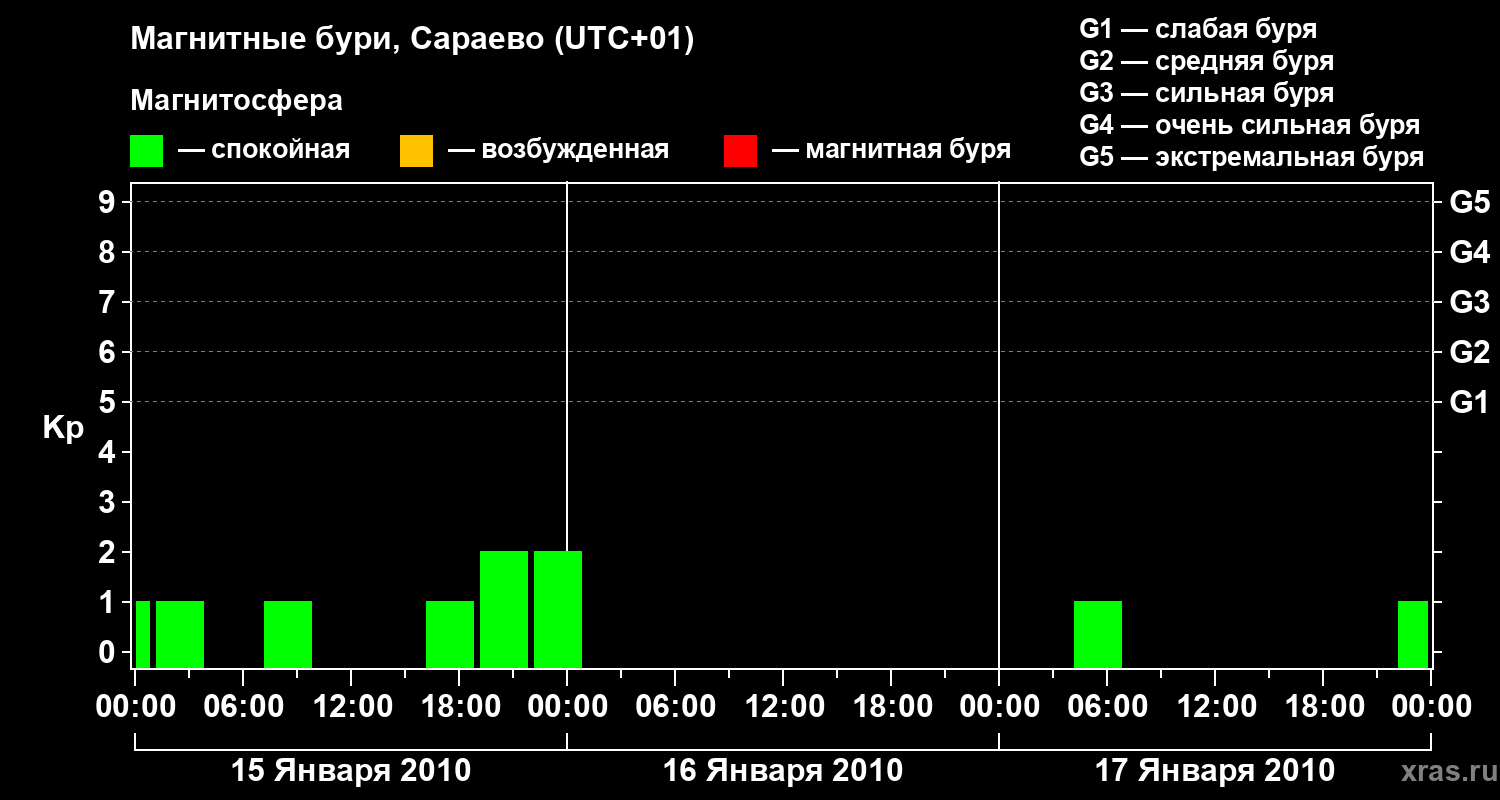 Изменения геомагнитного индекса Kp с 15 по 17 января 2010 года для средних широт