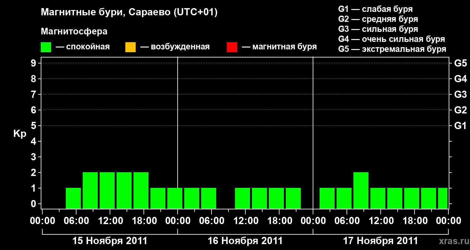 Изменения геомагнитного индекса Kp с 15 по 17 ноября 2011 года для средних широт