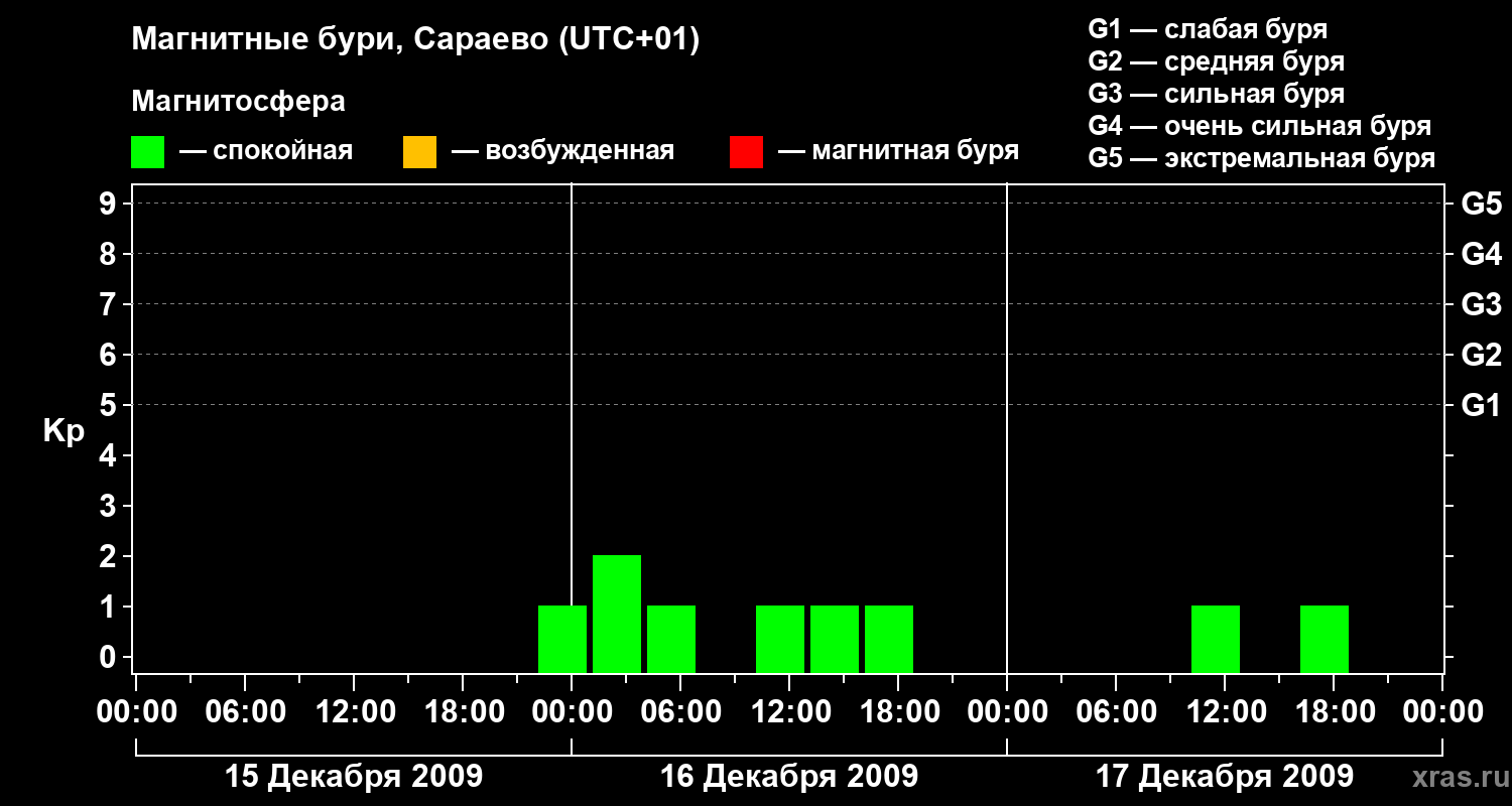 Изменения геомагнитного индекса Kp с 15 по 17 декабря 2009 года для средних широт
