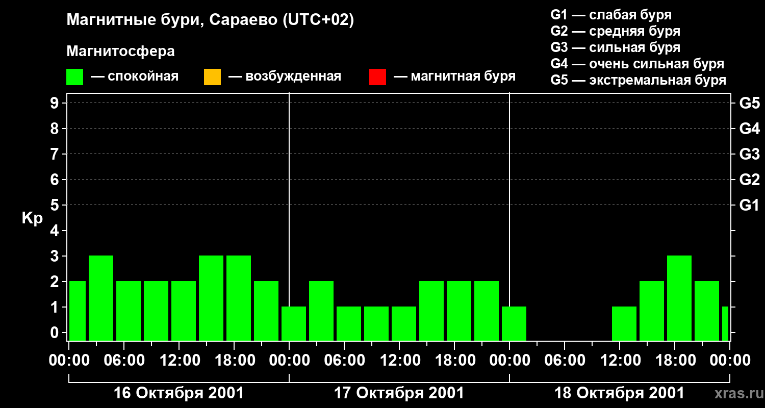 Изменения геомагнитного индекса Kp с 16 по 18 октября 2001 года для средних широт
