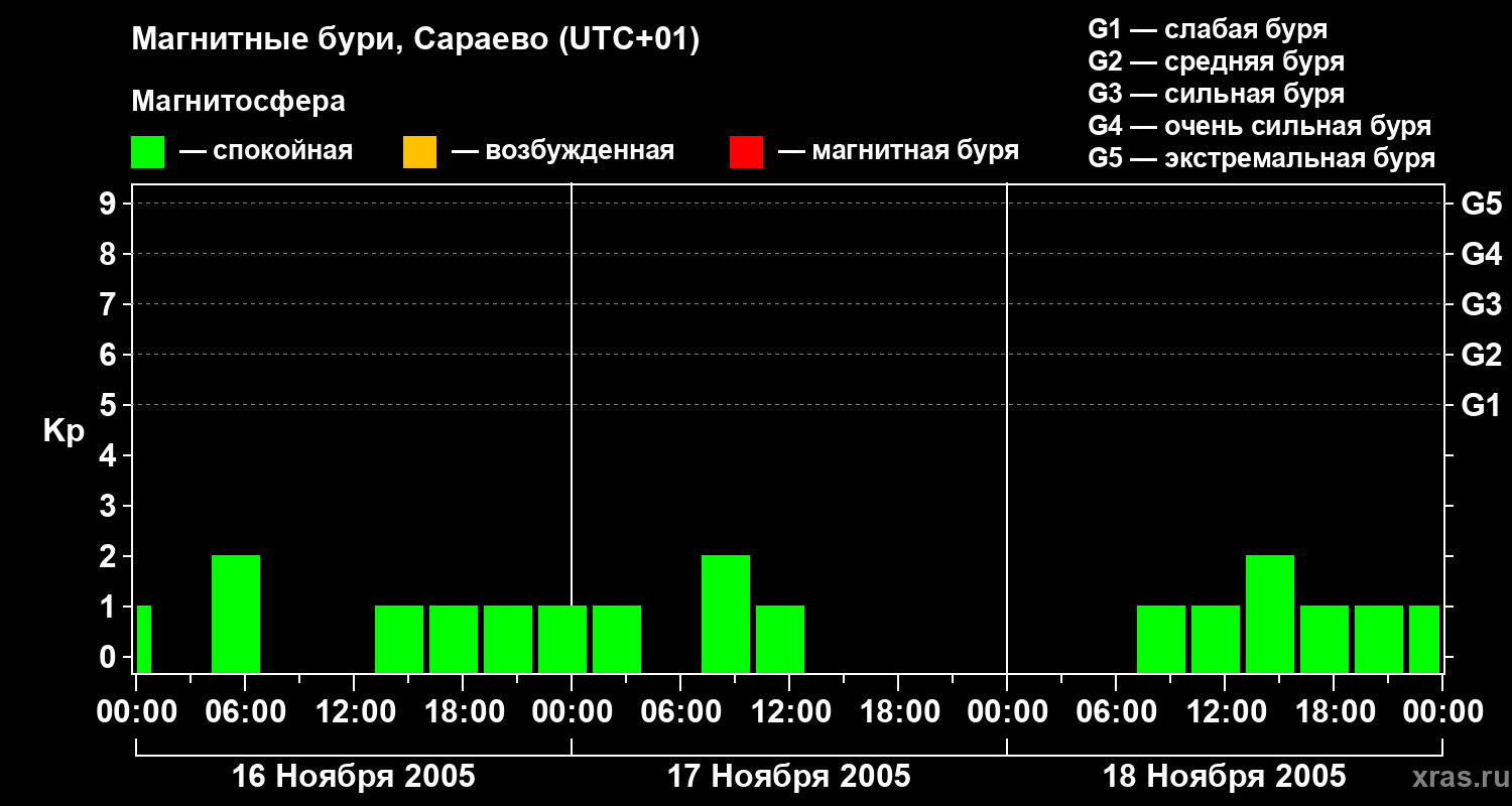 Изменения геомагнитного индекса Kp с 16 по 18 ноября 2005 года для средних широт