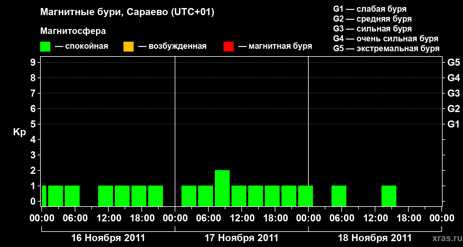 Изменения геомагнитного индекса Kp с 16 по 18 ноября 2011 года для средних широт