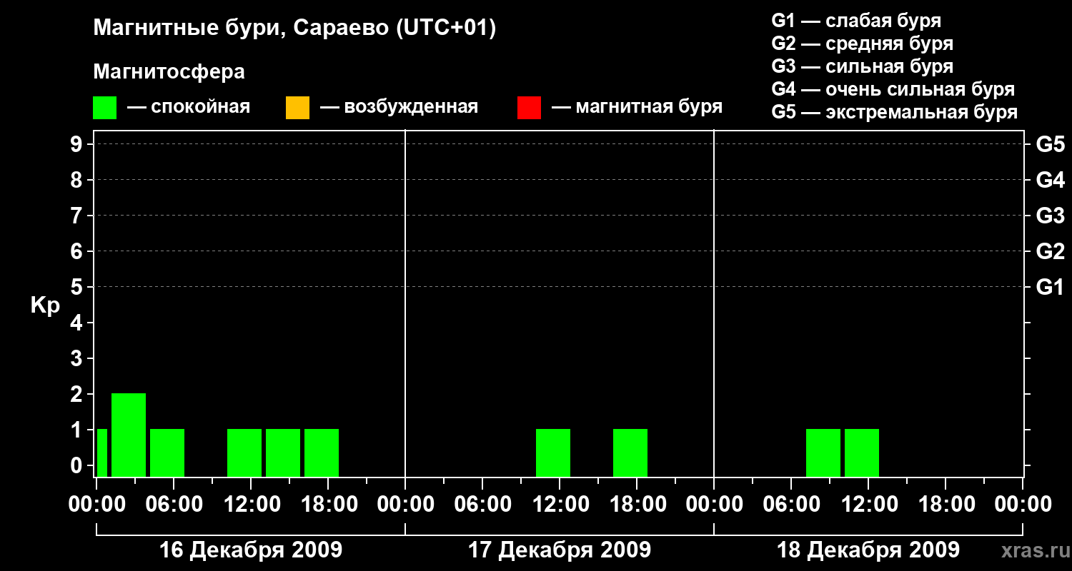 Изменения геомагнитного индекса Kp с 16 по 18 декабря 2009 года для средних широт
