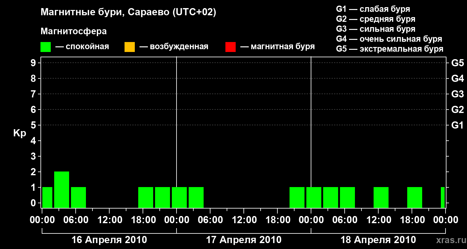 Изменения геомагнитного индекса Kp с 16 по 18 апреля 2010 года для средних широт