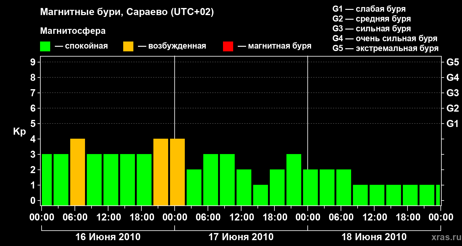 Изменения геомагнитного индекса Kp с 16 по 18 июня 2010 года для средних широт