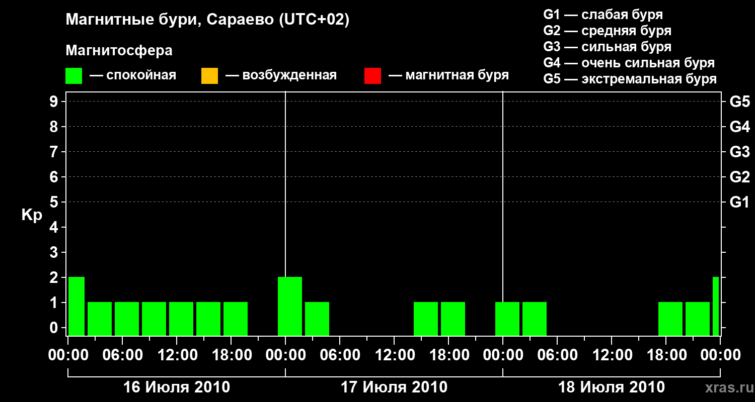 Изменения геомагнитного индекса Kp с 16 по 18 июля 2010 года для средних широт