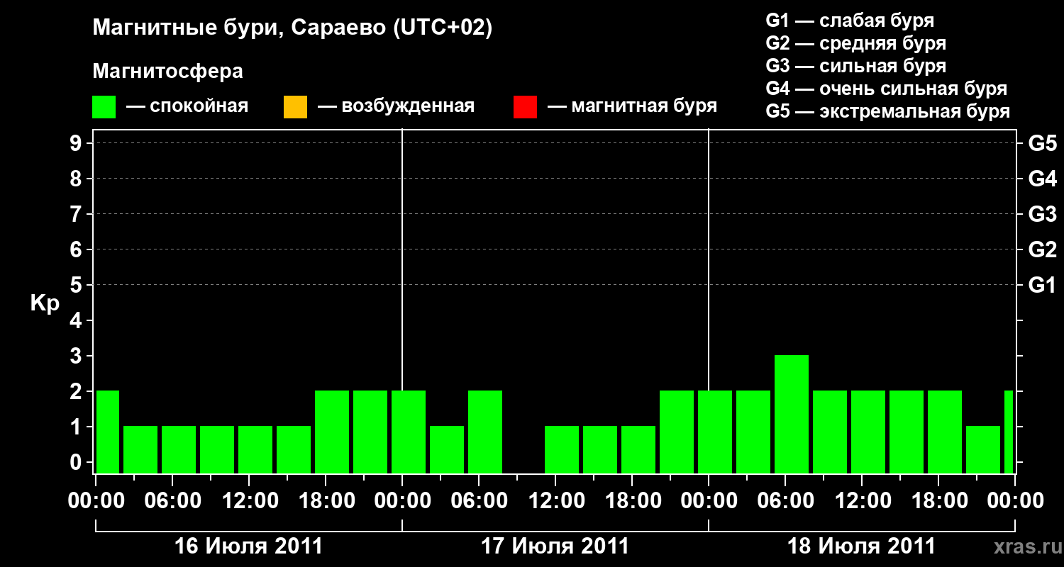 Изменения геомагнитного индекса Kp с 16 по 18 июля 2011 года для средних широт
