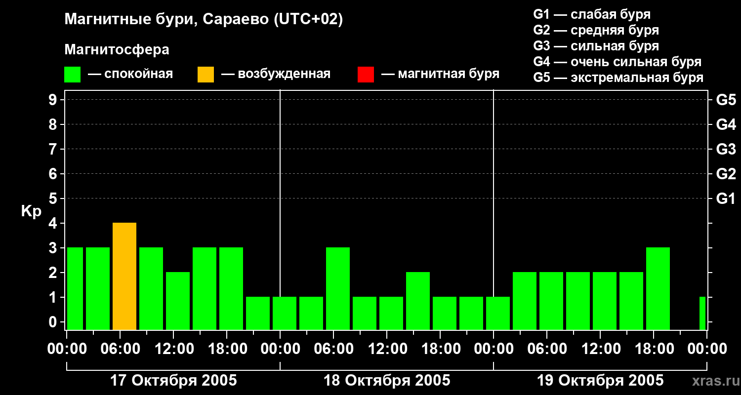 Изменения геомагнитного индекса Kp с 17 по 19 октября 2005 года для средних широт