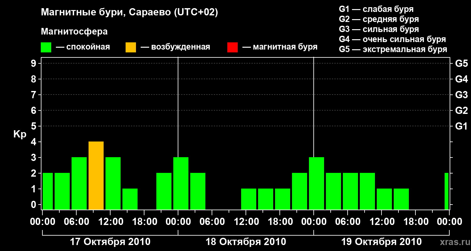 Изменения геомагнитного индекса Kp с 17 по 19 октября 2010 года для средних широт