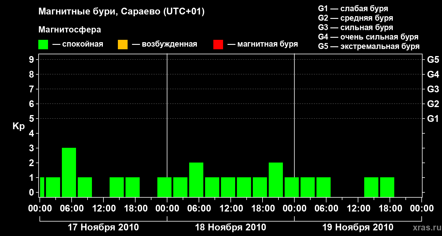 Изменения геомагнитного индекса Kp с 17 по 19 ноября 2010 года для средних широт