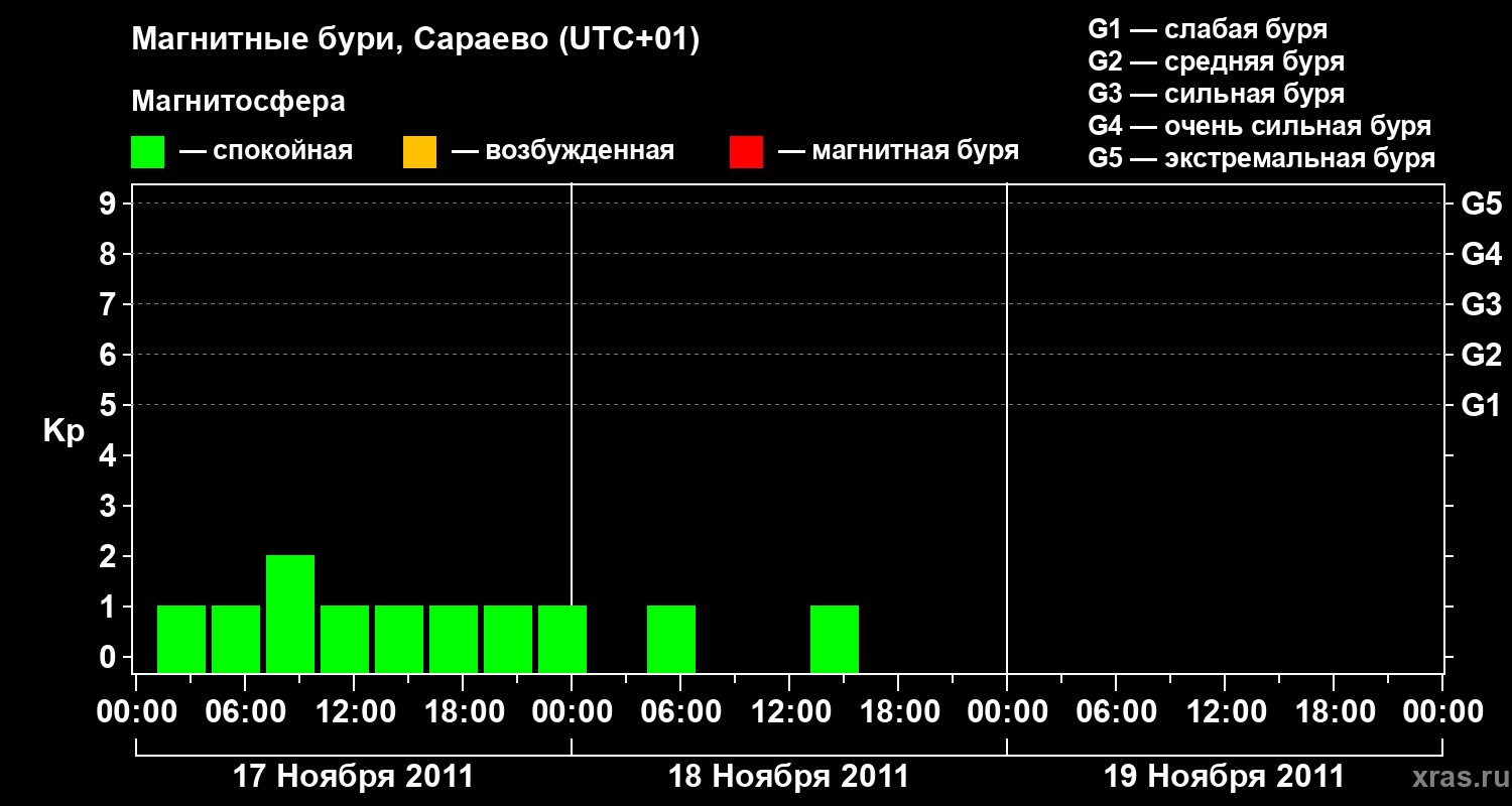 Изменения геомагнитного индекса Kp с 17 по 19 ноября 2011 года для средних широт