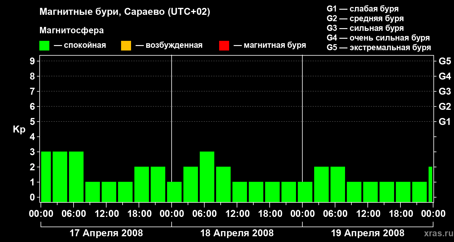 Изменения геомагнитного индекса Kp с 17 по 19 апреля 2008 года для средних широт