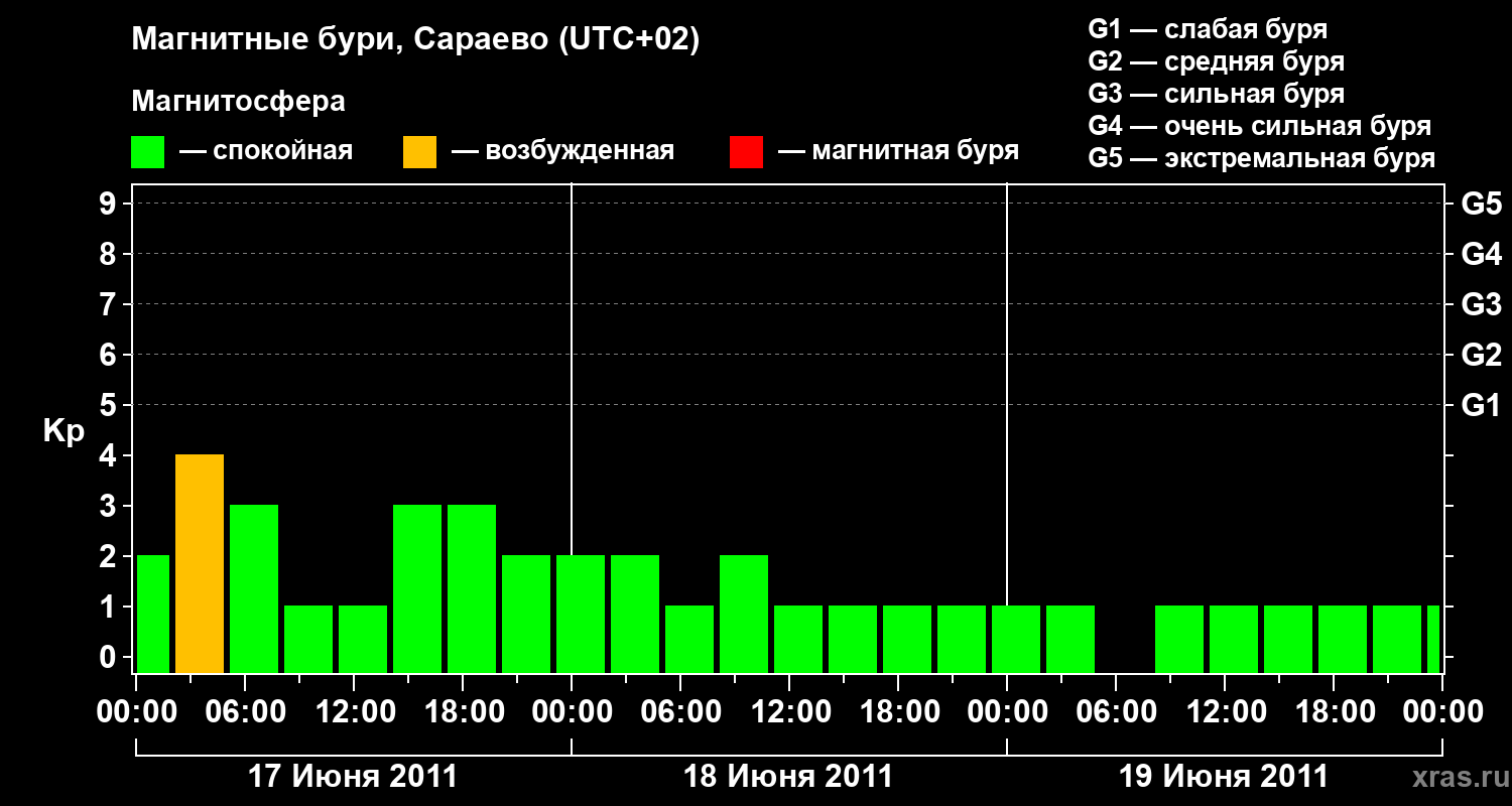 Изменения геомагнитного индекса Kp с 17 по 19 июня 2011 года для средних широт