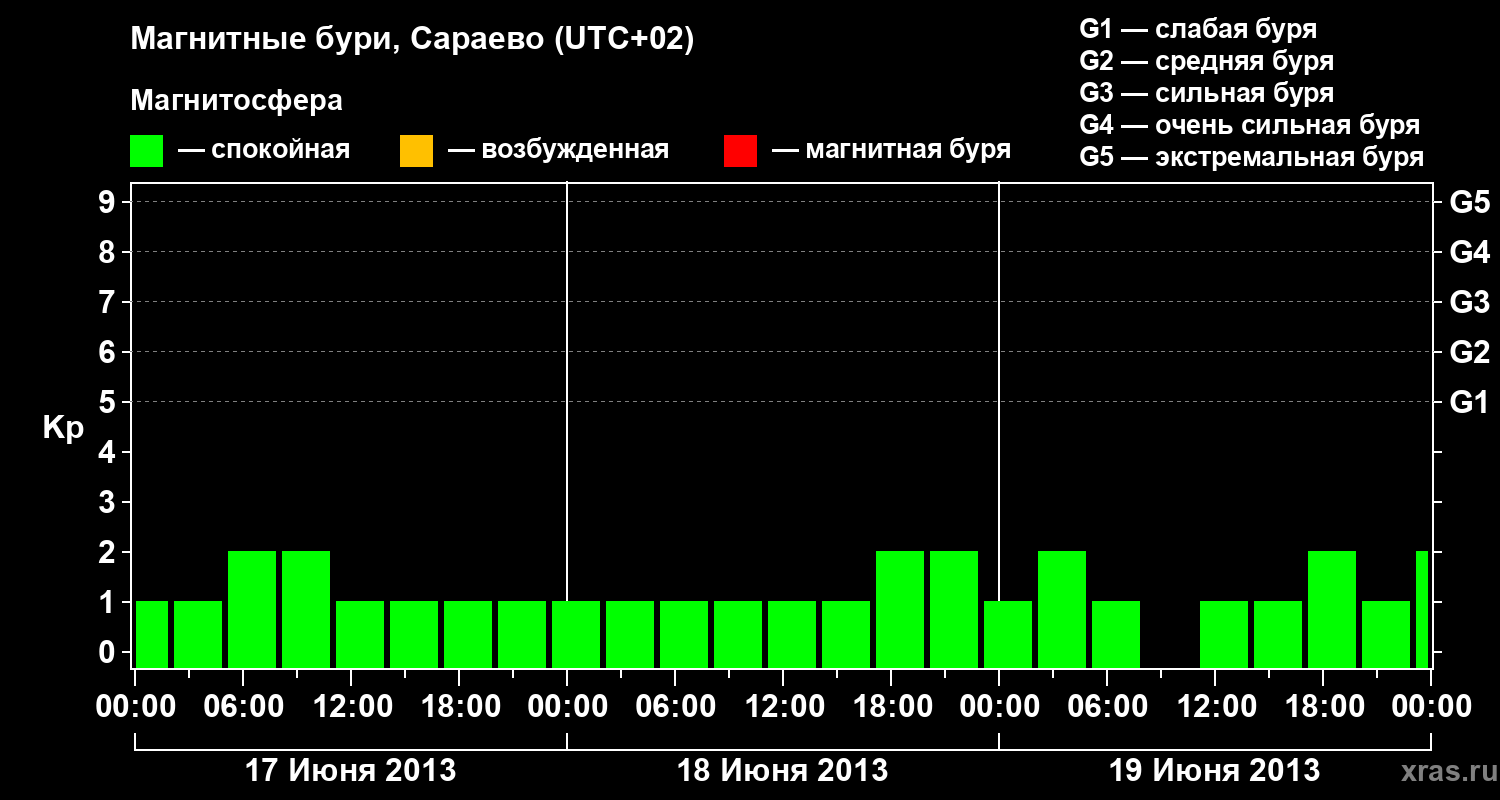 Изменения геомагнитного индекса Kp с 17 по 19 июня 2013 года для средних широт