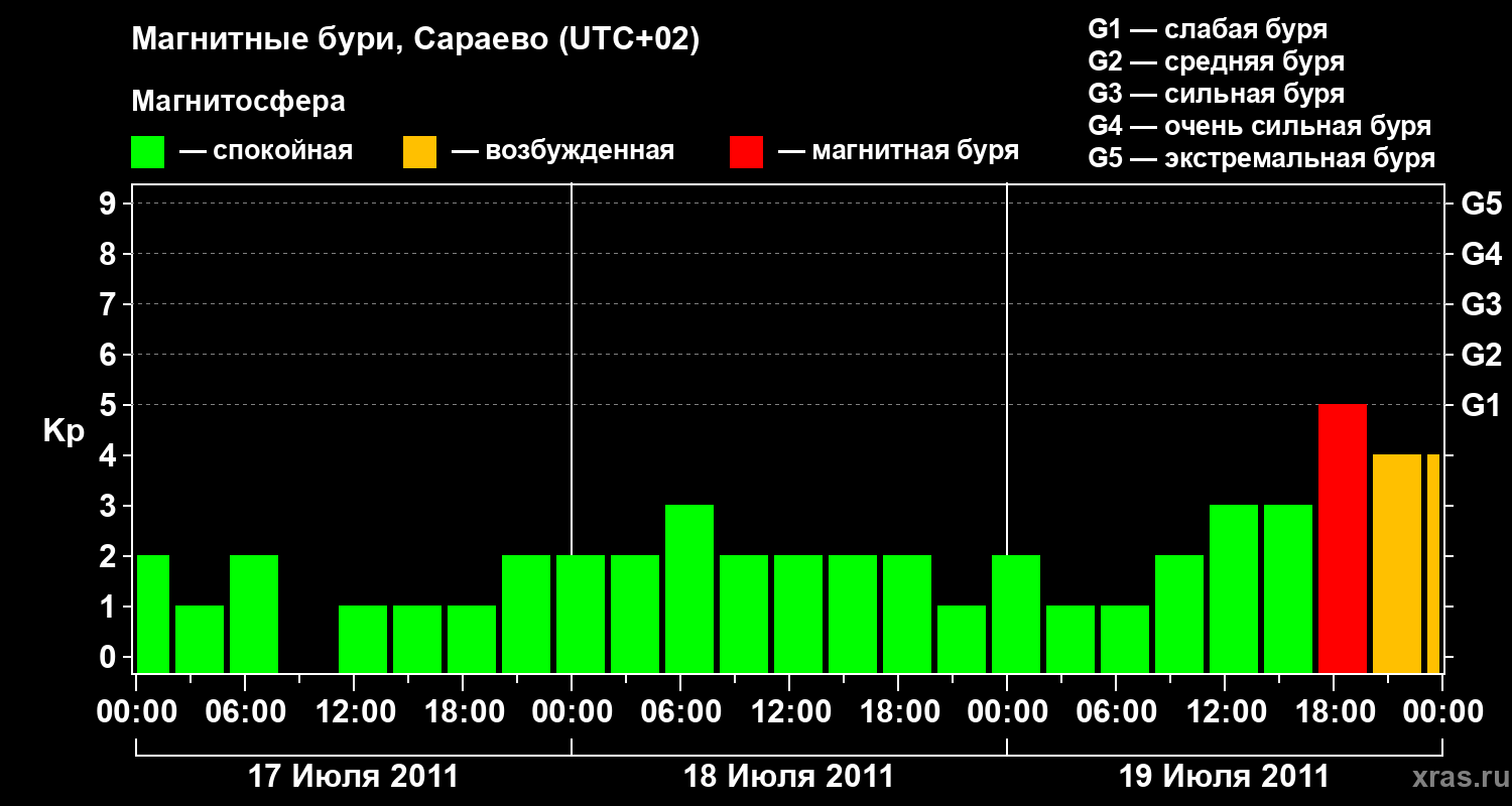 Изменения геомагнитного индекса Kp с 17 по 19 июля 2011 года для средних широт