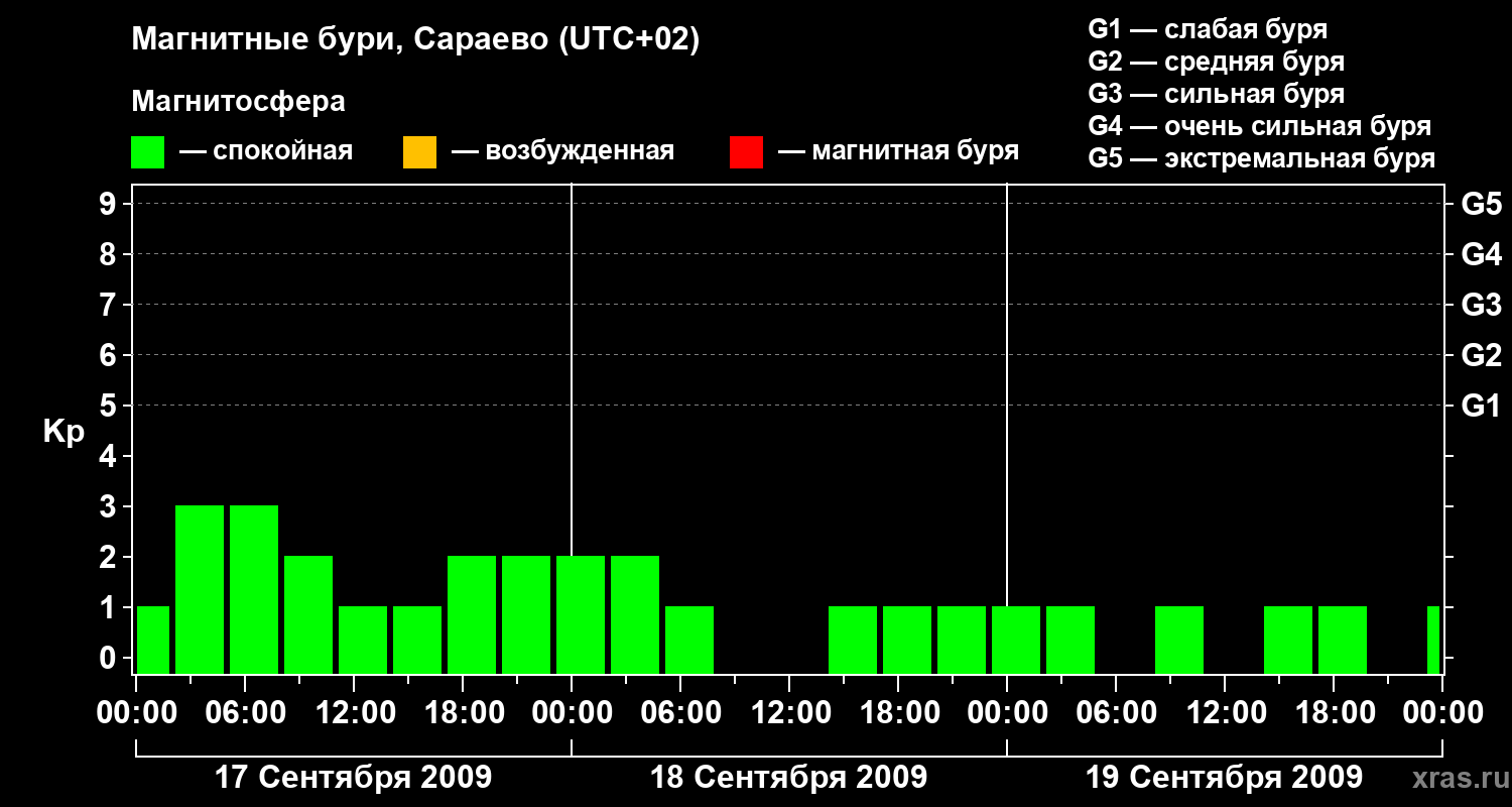 Изменения геомагнитного индекса Kp с 17 по 19 сентября 2009 года для средних широт