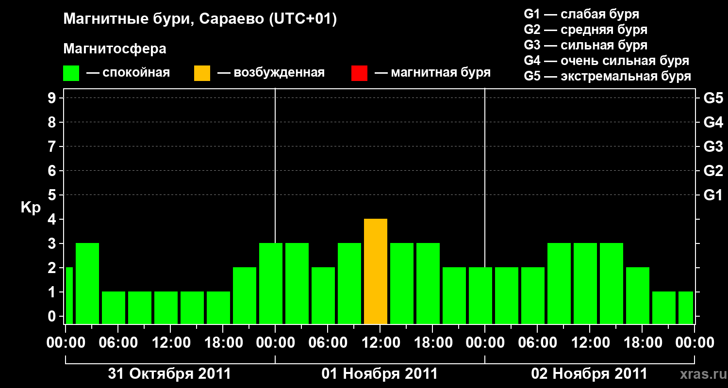 Изменения геомагнитного индекса Kp с 31 октября по 2 ноября 2011 года для средних широт