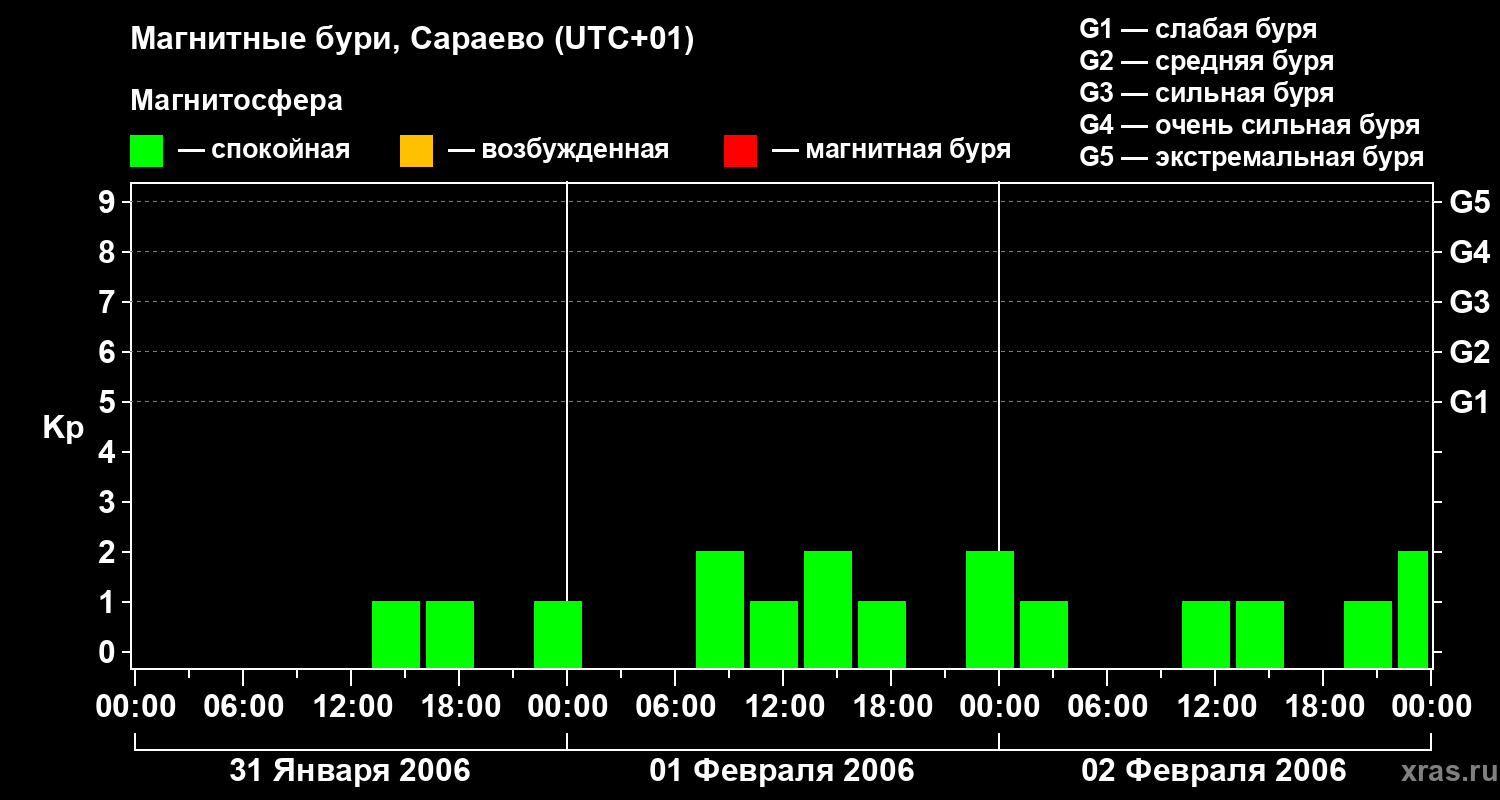 Изменения геомагнитного индекса Kp с 31 января по 2 февраля 2006 года для средних широт