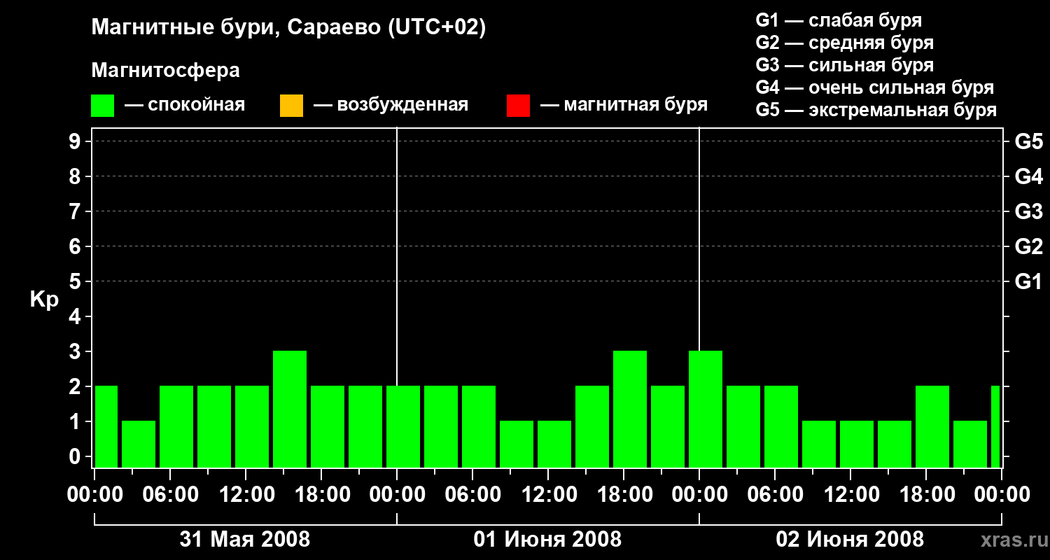 Изменения геомагнитного индекса Kp с 31 мая по 2 июня 2008 года для средних широт