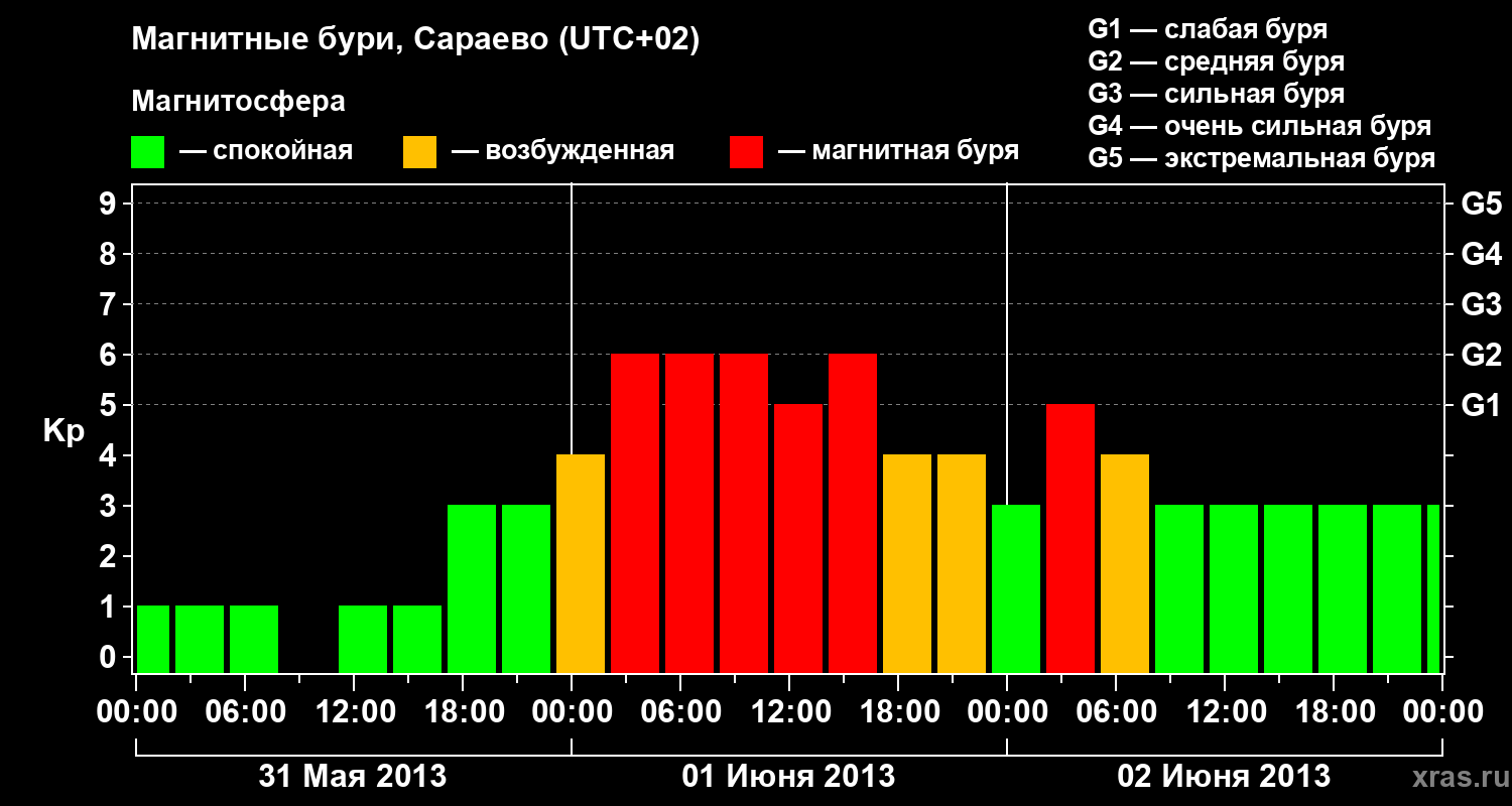 Изменения геомагнитного индекса Kp с 31 мая по 2 июня 2013 года для средних широт