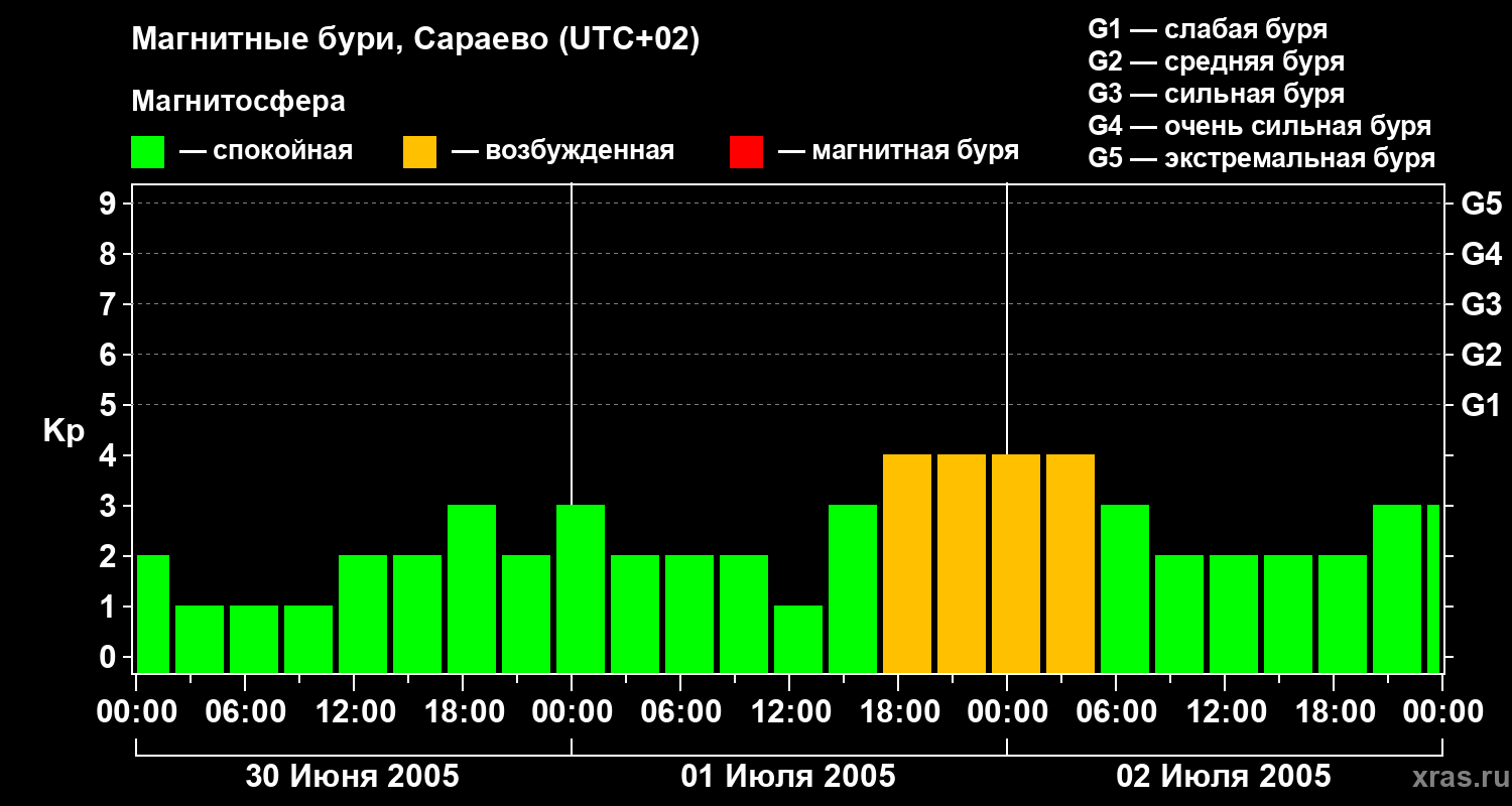 Изменения геомагнитного индекса Kp с 30 июня по 2 июля 2005 года для средних широт