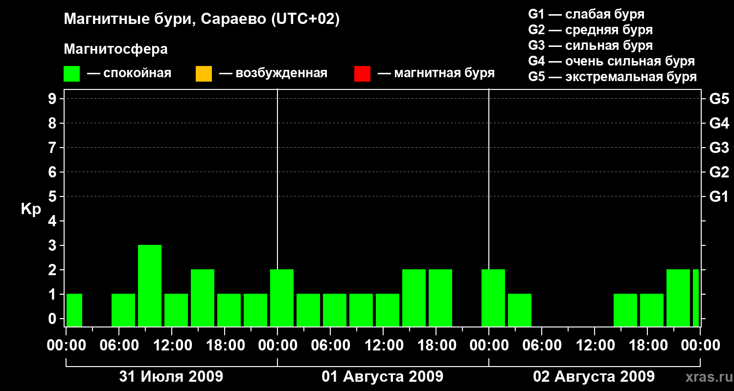 Изменения геомагнитного индекса Kp с 31 июля по 2 августа 2009 года для средних широт