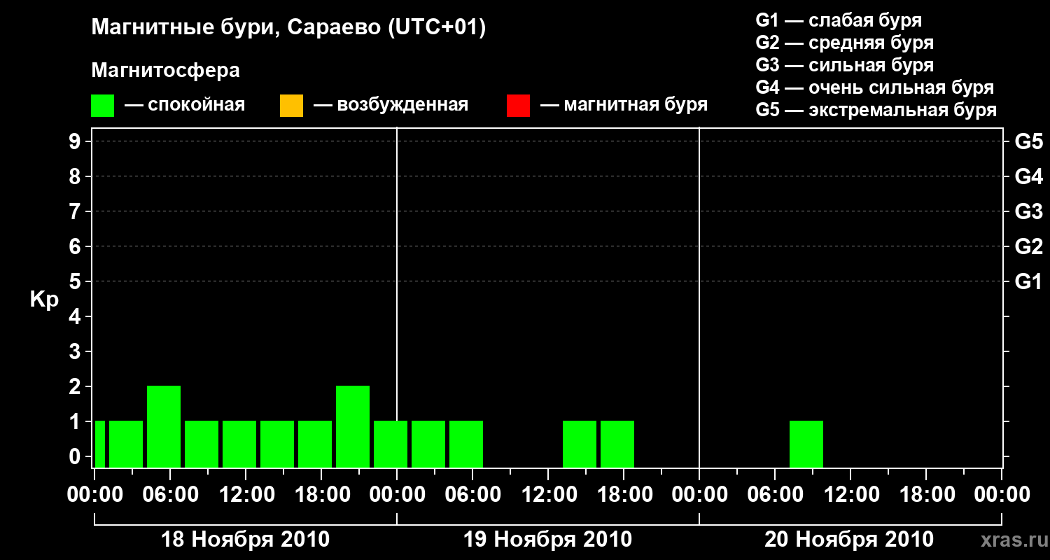 Изменения геомагнитного индекса Kp с 18 по 20 ноября 2010 года для средних широт