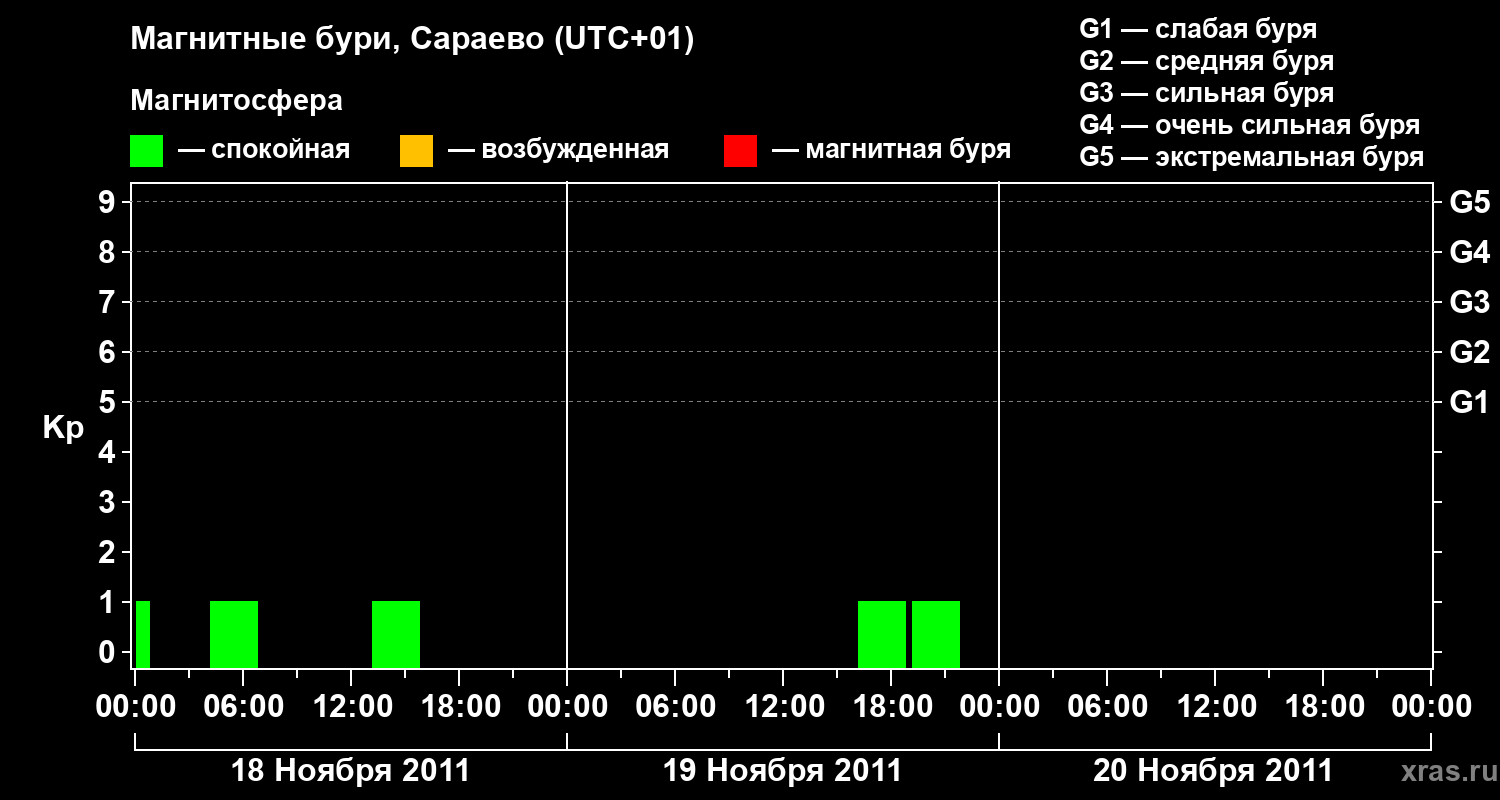 Изменения геомагнитного индекса Kp с 18 по 20 ноября 2011 года для средних широт
