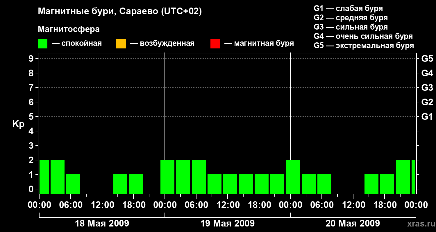 Изменения геомагнитного индекса Kp с 18 по 20 мая 2009 года для средних широт