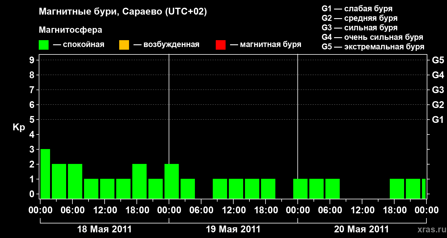 Изменения геомагнитного индекса Kp с 18 по 20 мая 2011 года для средних широт