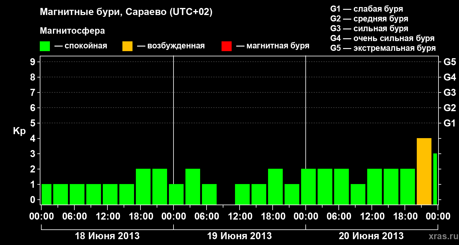 Изменения геомагнитного индекса Kp с 18 по 20 июня 2013 года для средних широт