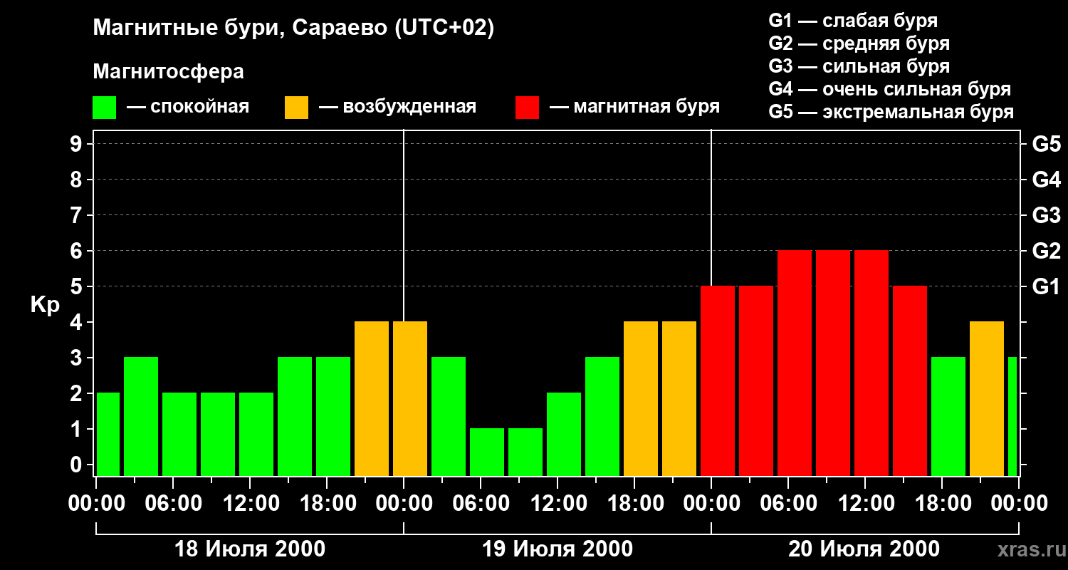 Изменения геомагнитного индекса Kp с 18 по 20 июля 2000 года для средних широт