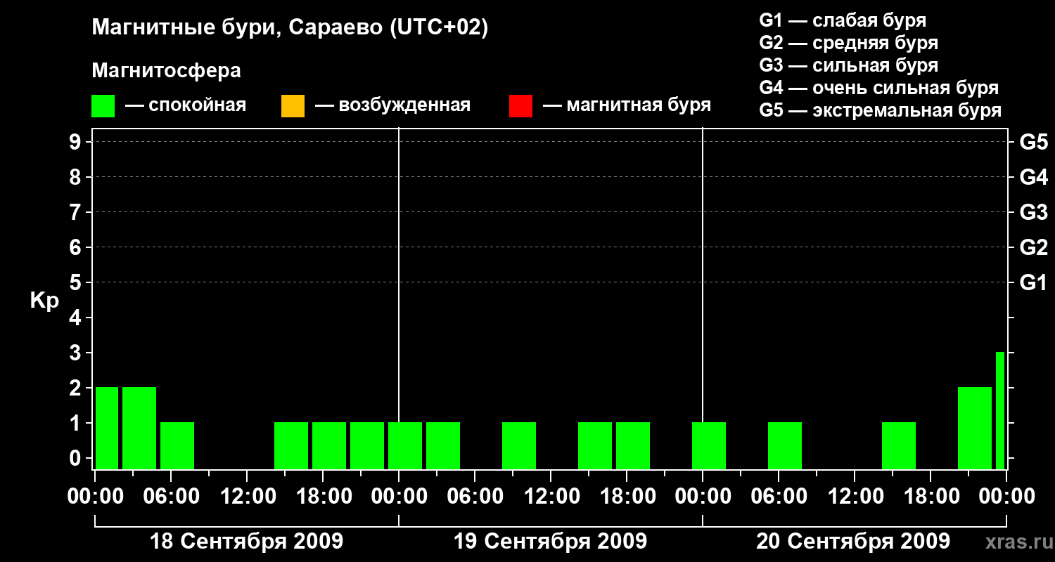 Изменения геомагнитного индекса Kp с 18 по 20 сентября 2009 года для средних широт