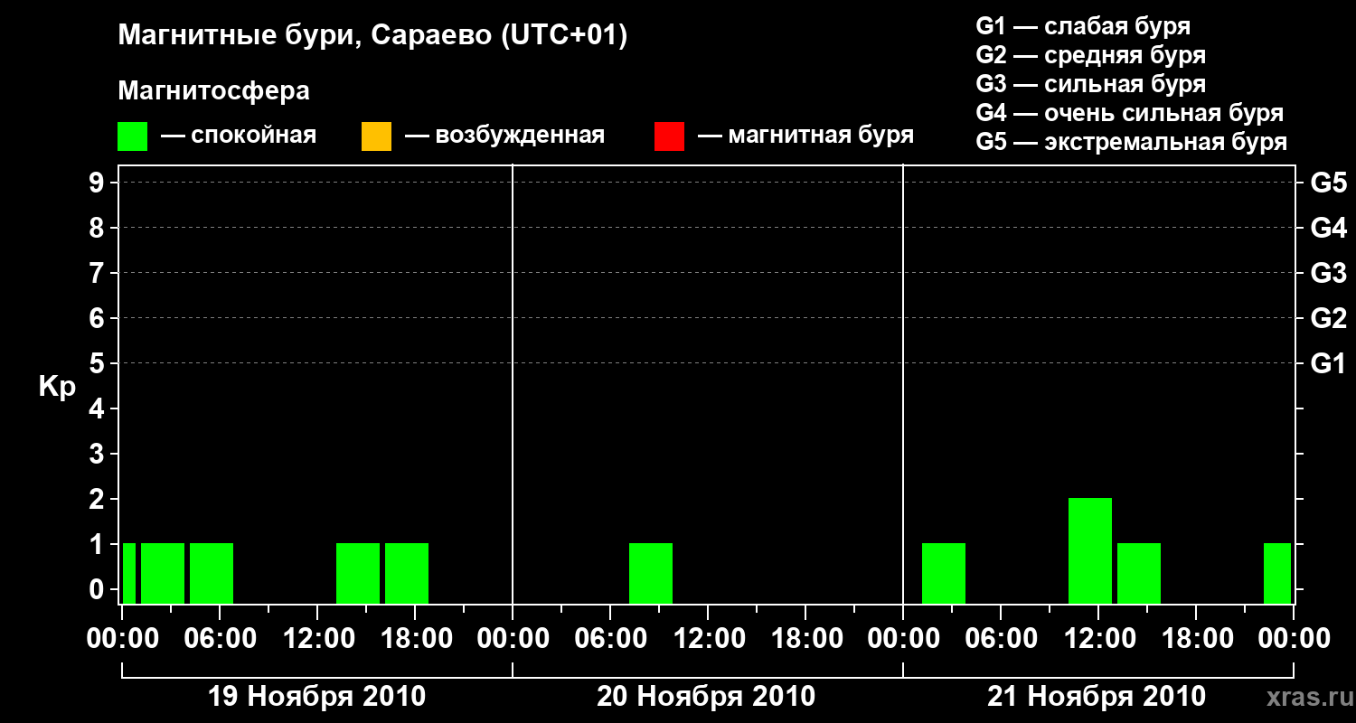 Изменения геомагнитного индекса Kp с 19 по 21 ноября 2010 года для средних широт