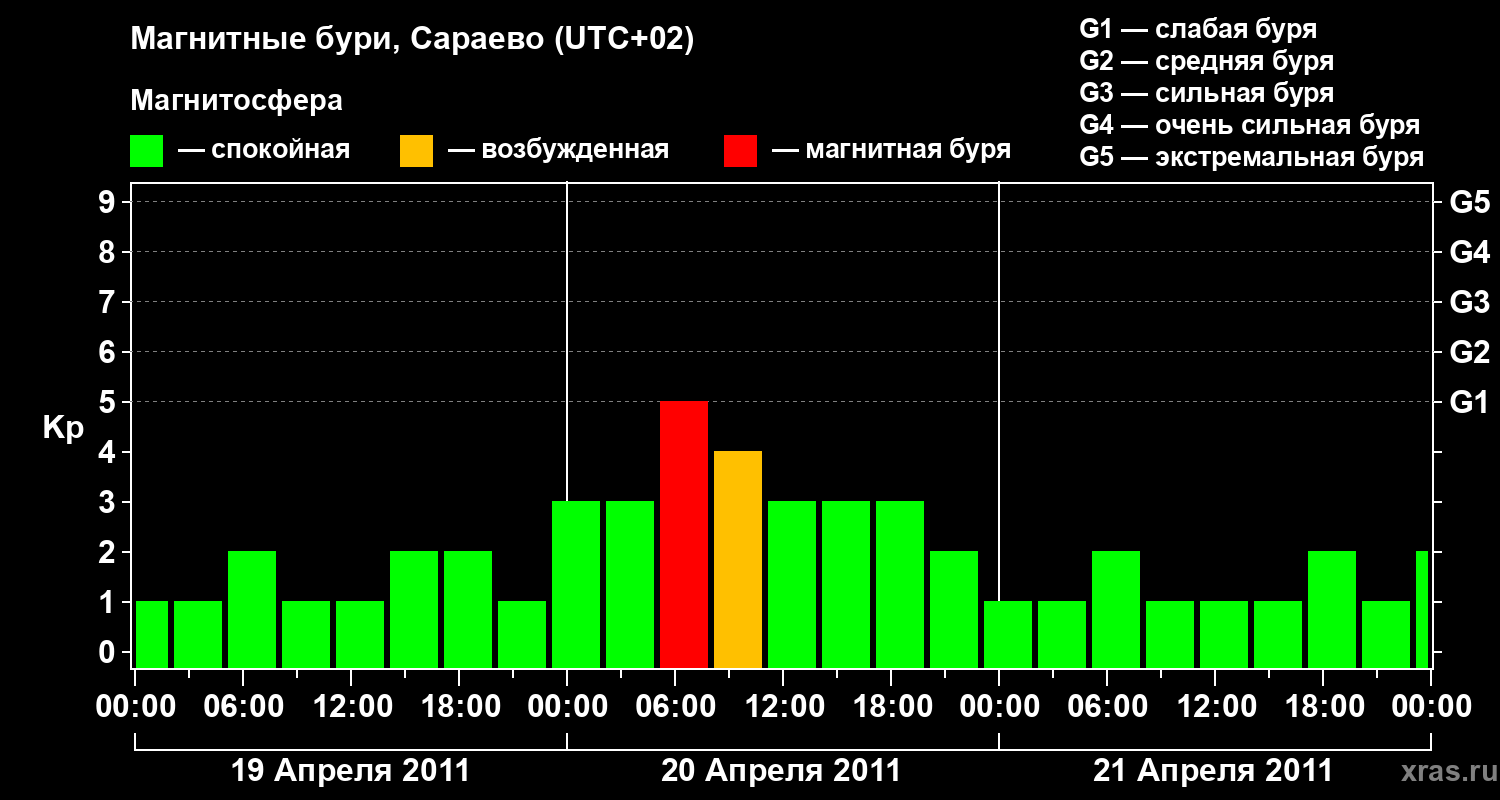Изменения геомагнитного индекса Kp с 19 по 21 апреля 2011 года для средних широт