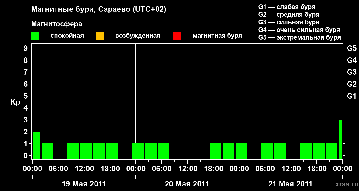 Изменения геомагнитного индекса Kp с 19 по 21 мая 2011 года для средних широт