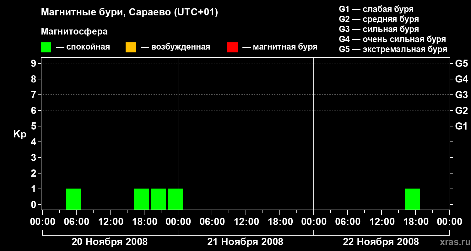 Изменения геомагнитного индекса Kp с 20 по 22 ноября 2008 года для средних широт