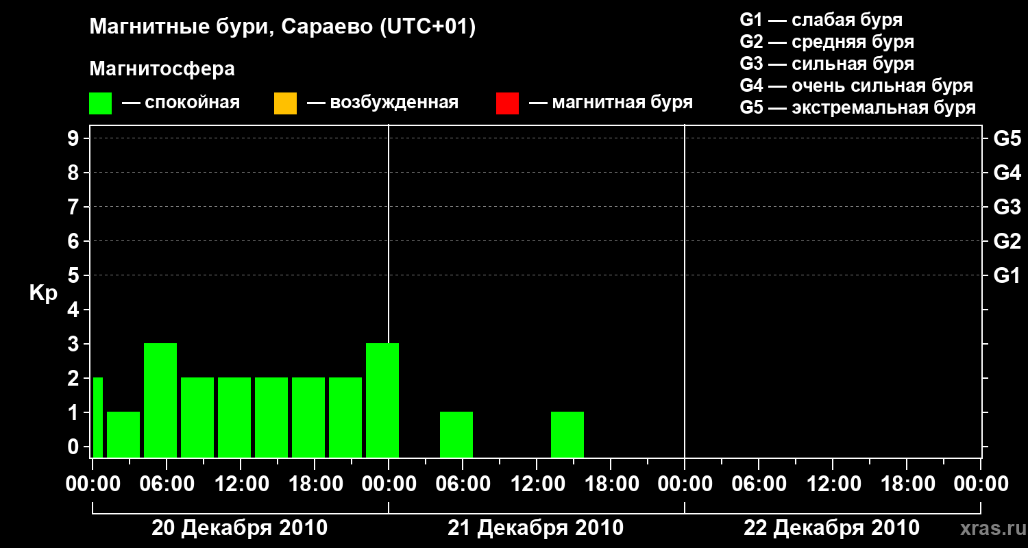 Изменения геомагнитного индекса Kp с 20 по 22 декабря 2010 года для средних широт