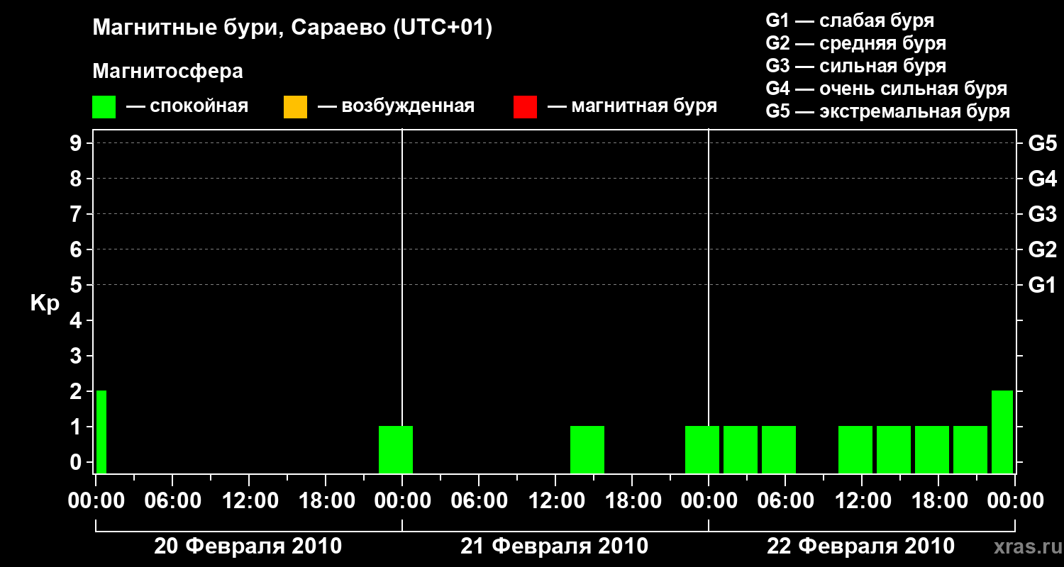 Изменения геомагнитного индекса Kp с 20 по 22 февраля 2010 года для средних широт