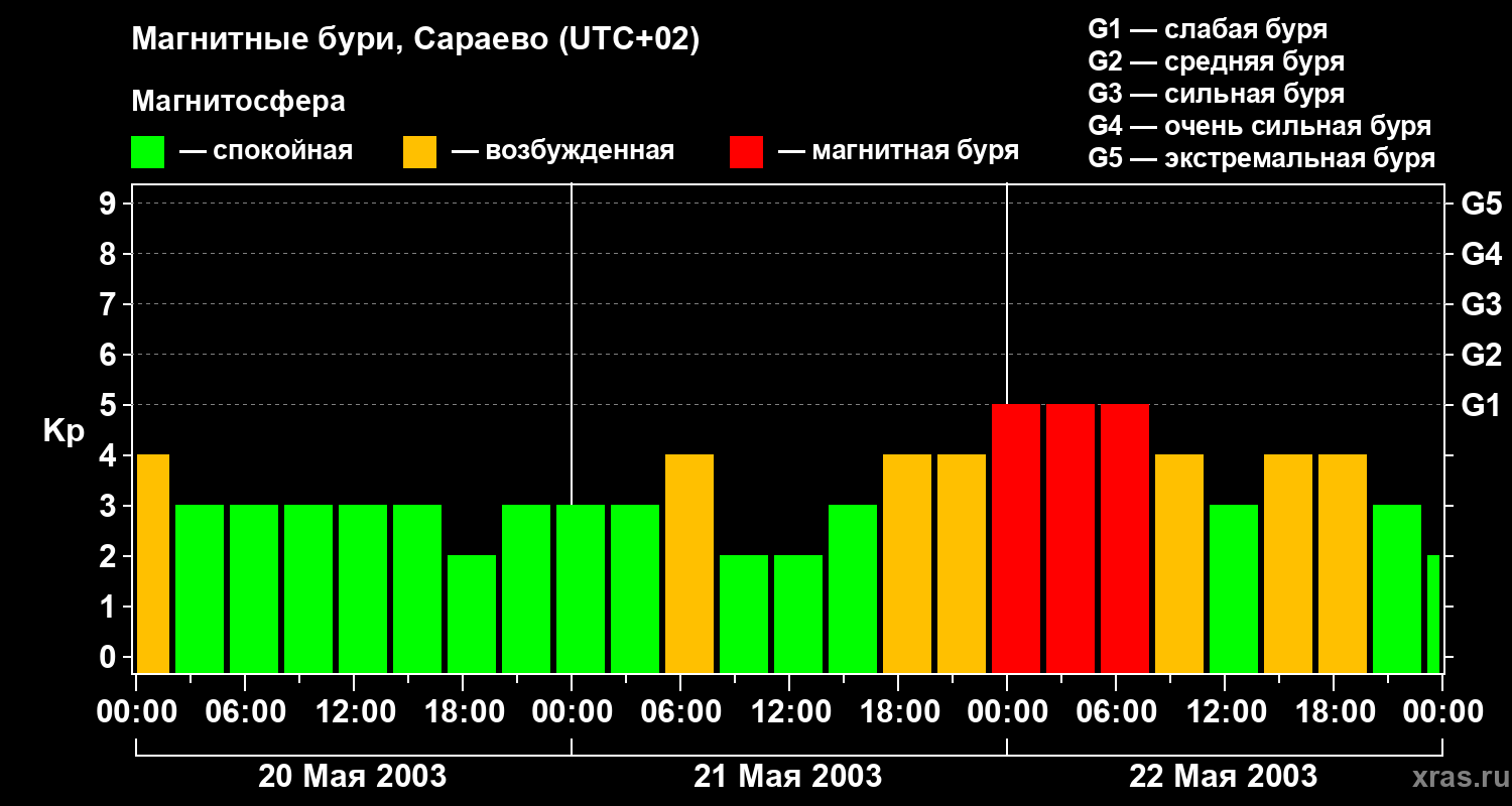 Изменения геомагнитного индекса Kp с 20 по 22 мая 2003 года для средних широт